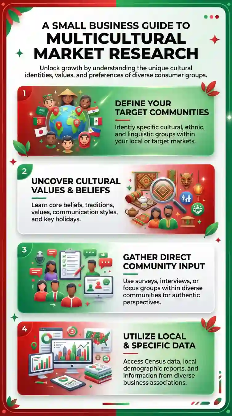 A: Multicultural market research is the process of understanding the values, preferences, behaviors, and purchasing habits of diverse cultural audiences — as real communities with distinct identities, not demographic checkboxes. Why it matters for small businesses: