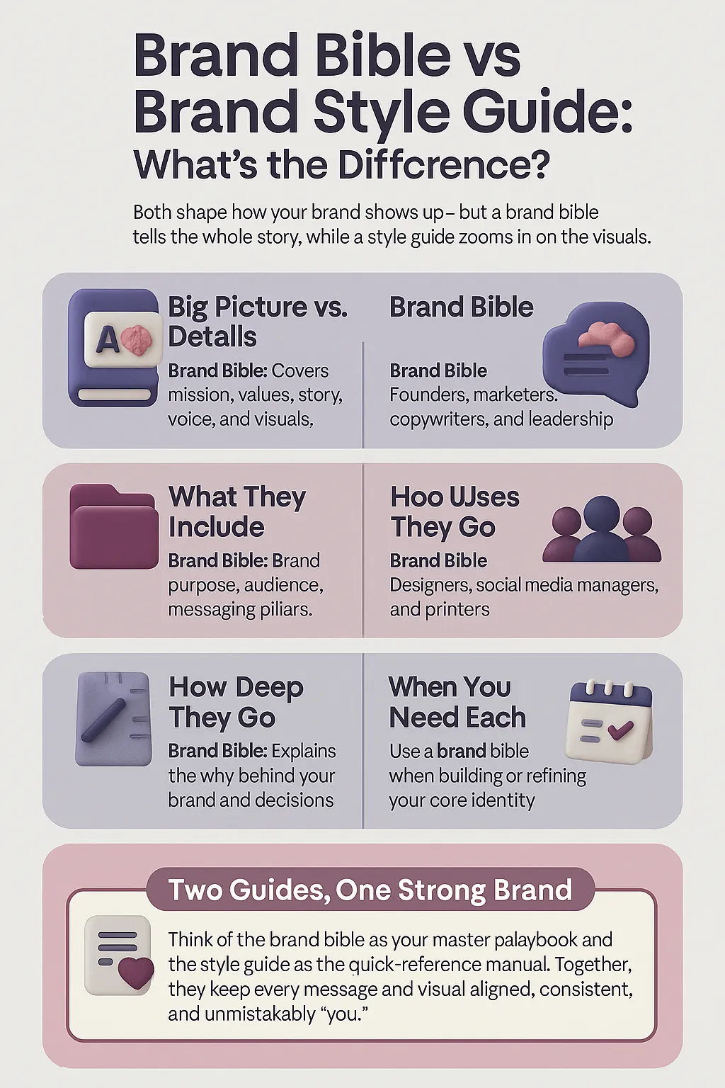When it comes to defining your brand, both a brand bible and a brand style guide are essential—but they serve different layers of your identity. Think of them as two parts of the same engine: one drives meaning, the other drives execution.