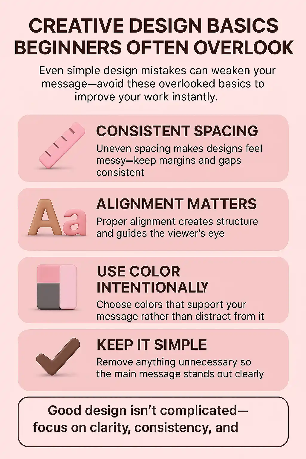 Beginners tend to over-focus on colors, icons, and decorative elements, missing the structural basics that make design communicate effectively. Creative design starts with arrangement, clarity, and intention—not decoration. Elements like spacing, alignment, and contrast determine whether a design feels balanced or confusing.